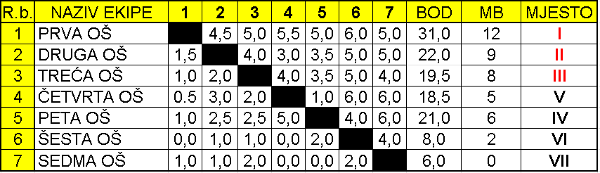 1. mjesto: Superiorna Prva osnovna škola, koja je osvojila turnir sa maksimalnih 12 meč bodova.